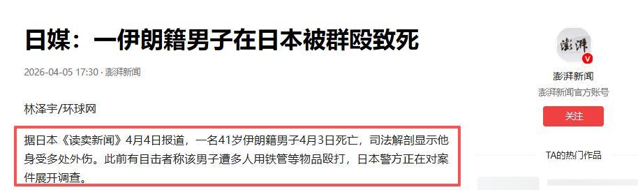 本以为日本这是刻意挑衅中国,最近一件事突然引发国际关注,一名伊朗男子在日本遭到日本人围殴致死,难以想象,在中东战争本来就胶着之际,高市早苗居然敢火上浇油。