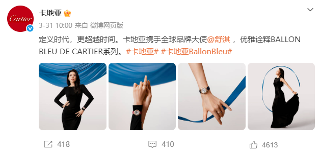3月31日,珠宝腕表品牌卡地亚宣布舒淇加入品牌成为了全球品牌大使,优雅诠释BALLON BLEU DE CARTIER系列,并释出多套绝美广告造型,女神与奢侈品的适配度堪称完美。